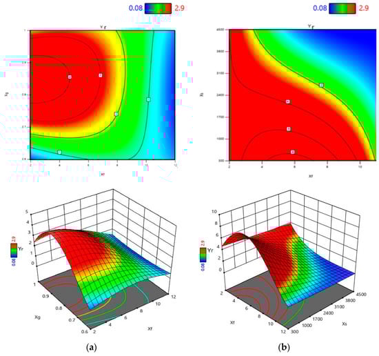 Concerning the different terms of the equation, the ANOVA results show the statistical significance of the linear terms and the effect of their interactions. The factor Xf is responsible for the main effect and contributes to about 25.73% of the data variance. The second and third terms are the interaction between Xf and, respectively Xg and the quadratic form of Xg2. These two interactions contribute to about 22.4% of the data variance. This interaction relationship between Xf and Xg can be illustrated in Figure 13a. As shown in this figure, the contour lines are of higher orders. In addition, the quadratic form of Xf gives a significant interaction effect with each of Xs and Xp with about 9.19% of the two terms. The interaction of Xf and Xs is shown in Figure 13b. The effects of Xs and Xp on Yr are significant and their contributions on the data variance of Yr can be consider as to be similar. Many other terms are statistical significant, that have p-value < 0.05. These terms include Xg², Xf², Xg, Xs Xg, Xf²Xp, Xp Xg, XpXg², Xs Xp Xg, and Xf Xp. Their aggregated contribution effect on the variation of Yr is about 24.1%. The effects of the other terms on Yr are statistically insignificant where the p-value > 0.05. These terms represent the interaction effect of XsXg², Xf Xs, and Xs Xp.