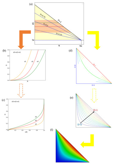 Schematic diagram of DDM concept. (a) S-N curve; (b) isostress curves with normal N-axis; (c) isostress curves with normalized N-axis; (d) isodamage curve converging to both N-axis and S-axis; (e) isodamage curves ranging from 0 to 1; (f) damage distribution map.