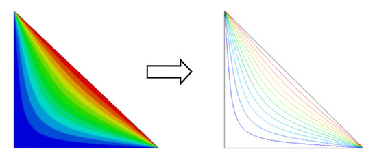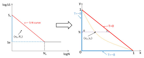 The above construction approach has some advantages: (1) only a few easily available material parameters are required, such as the S-N curve, ultimate strength Su, fatigue limit Se, etc.; (2) theoretically, an infinite number of isodamage curves can be extracted from the continuous DDM; (3) one DDM and the corresponding interpolation function are appropriate for a variety of damage calculation problems with the same boundary configurations. For example, if the S-N curves are a single line, the DDM, as in Figure 3, can be almost directly utilized except for minor treatments. This fact is significant for welded structures because there are many similar S-N curves provided by fatigue design standards and codes according to welded joint classifications. Section 2.2 focuses on such treatments in detail.