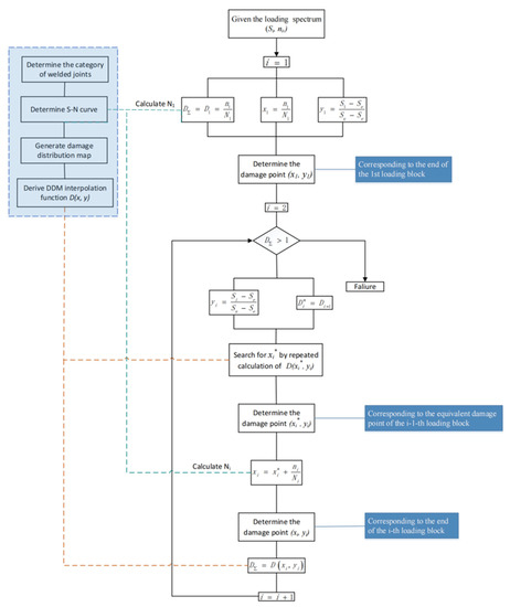 (3) Third, from the second loading block on, the damage transfer must be introduced. Since there is no explicit description of the isodamage curve in the DDM, the damage distribution interpolation function D(x,y) should be used to search for the appropriate isodamage curve. Specifically, assuming that the damage point at the end of the i−1-th loading block is (xi−1,yi−1), and the damage is Di−1, the damage at the beginning of the i-th loading block can be determined as Di* = Di−1. Then, yi, corresponding to the i-th loading block, can be calculated by Equation (4). Letting xi vary in (0,1) with a small interval, damage calculation trials are conducted based on Equation (3) repeatedly until the calculated damage value approaches Di* in a pre-set tolerance; then, xi* equals to xi. Thus, the transferred damage point (xi*,yi) can be determined. It should be noted that, although the damage points (xi*,yi) are not determined by graphically moving damage points (xi−1,yi−1) along the isodamage curve in the DDM, they do lie on the same isodamage curve.