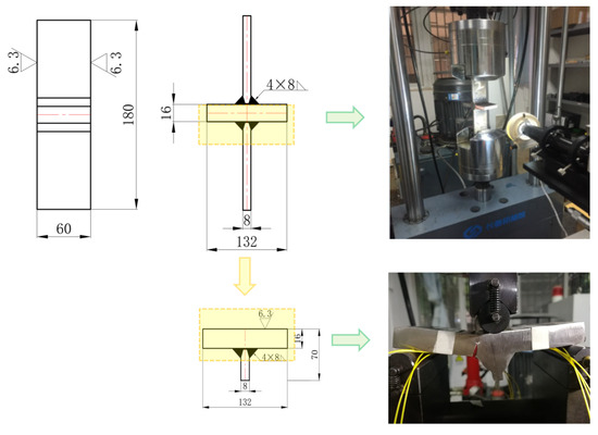 To verify the proposed damage accumulations approach, fatigue tests of cruciform joint specimens and T joint specimens were conducted, as shown in Figure 6. All specimens were first welded and fabricated as cruciform joints with prefabricated grooves based on welding standards to ensure all the welds’ full penetration. The material of the base plates was low alloy structural steel Q345B, and the welding wire used was CHW-50C6. Then, some cruciform joints were cut and fabricated to be T joints, which could keep all the welds of two kinds of specimens with similar welding quality and geometries. The mechanical properties and chemical compositions of Q345B are presented in Table 1 and Table 2, respectively (reported in the specification from the steelmaking plant). The main welding process parameters are reported in Table 3. It should be noted that Q345B has good weldability, leading to a similar yield strength for the base metal and the weld seam. Thus, the strength matching characteristics was not considered in this paper. Moreover, there are also significant differences in the microstructures of different zones, such as the base material, weld seam, and HAZ. However, those differences mainly affect the early stage behaviors, such as crack nucleation and short crack propagation, which are beyond the scope of this paper.