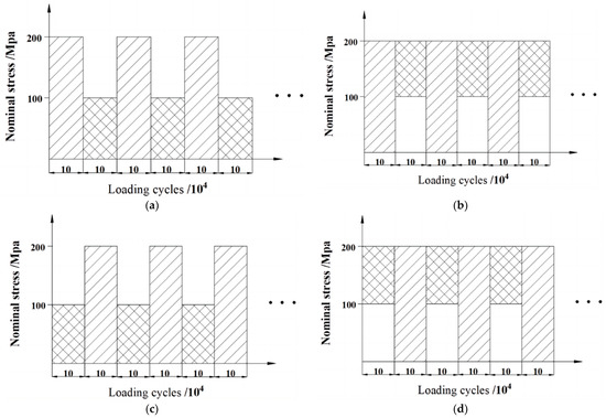 In our research, tensile fatigue tests were conducted for the cruciform joint specimens, and three-point-bending fatigue tests were conducted for the T joint specimens. Both the tensile fatigue tests and three-point-bending fatigue tests were under two-level loading block sequences, as shown in Figure 7, in which the stress range was 200 Mpa for the H-level loading block and 100 Mpa for the L-level loading block. The stress ratio was configured to be 0 for the H-level loading block. For the L-level loading block, two kinds of stress ratios with values of 0 and 0.5, respectively, were configured to allow for the effect of mean stresses. It should be pointed out that the nominal stress through the weld toe section of the specimen was adopted to characterize the loading spectrum here to ignore the stress concentration at the weld toe. Thus, the stress parameter used in the calculation can be obtained by basic material mechanics.