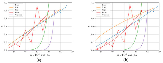 The relationship between the calculated damage and the corresponding loading cycles are plotted, as shown in Figure 10. It can be observed that Miner’s law and the DLDR model appear obviously linear, while the Aeran model, the Rege model and the proposed approach show a nonlinear tendency. It should be noted that the Aeran model not only considers the load sequence effect but also introduces load interaction factors µi [23], which can well describe the effect of the next loading block on the previous loading block with different stress ranges. However, the Aeran model seems unsuccessful in our attempt. In Figure 10, the curve based on the Aeran model shows a zigzag shape, which may result from the lack of robustness and reliability of the algorithm. In fact, during the research, we found that the Aeran model is greatly affected by the stress levels and the S-N curve parameters. Sometimes, the algorithm could not even work normally due to the negative damage value. For comparison, the results of the Aeran model were fitted, and they are shown as the red solid line in Figure 10.