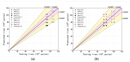 Assuming the critical damage is 1, fatigue lives are predicted. The comparison of the predicted lives with the testing lives is shown in Figure 11, among which the red area and yellow area correspond to the scatter bands with accuracy of 10% and 25% respectively. It can be seen that there are total seven red points based on the proposed approach inside the red scattered band with 10% accuracy of both (a) and (b), except only one point outside under simple tensile loading. Based on Miner, DDLR, Aeran and Rege models, the total numbers of the result points in the red scattered band of both (a) and (b) are 4, 6, 3 and 1 respectively. Therefore, the proposed model shows highest life prediction accuracy. It should be noted that, except the proposed approach, the result points based on the nonlinear models (Aeran and Rege model) are fewer than those of the linear models (Miner and DDLR model) in the red scattered band, which seems to show that linear models are better than nonlinear models except the proposed approach from the view of life prediction accuracy. However, it should be emphasized that the fatigue life here refers to the total life and the real damage evolution is not considered in its definition. If the crack evolution behavior needs to be considered, the nonlinear models especially the proposed model are of outstanding advantages.