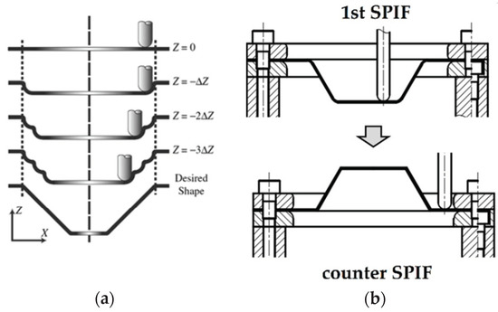 - Jung, K.S.; Yu, J.H.; Chung, W.J.; Lee, C.W. Tool path design of the counter single point incremental forming process to decrease shape error. Materials 2020, 13, 4719. [Google Scholar] [CrossRef] [PubMed]