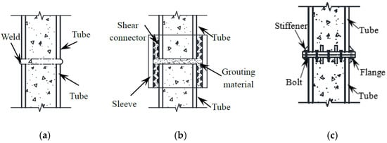 Common lengthening methods of steel tube of concrete-filled steel tube: (a) welding, (b) grouting sleeve connection, (c) flange connection.