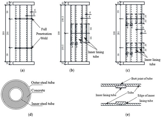Schematic diagram of steel components of some specimens: (a) specimen EW; (b) specimen M6C/M9C; (c) specimen E6B/E9B; (d) Cross-section; (e) Steel tube lengthened by thread through inner lining tube.