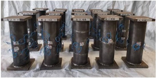 The test equipment is shown in Figure 5. Four displacement meters were arranged around the sample at 90° intervals, and a transverse strain gauge and a longitudinal strain gauge were pasted to the outer wall of the steel pipe at 90° intervals.