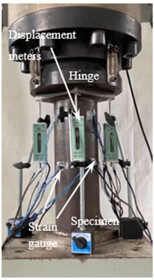 The sample was preloaded first [19,20,21,22]. The entire loading process adopted the method of load controlled. Within the elastic range, the loading of each stage was 1/10 of the estimated bearing capacity, the instrument data were recorded after each stage of loading, and the next stage of loading was carried out after holding the load for 2 min until it reached 60% of the estimated bearing capacity. Then, loading took place at the rate of 2 kN/s, and the loading stage was stopped when the compressive displacement reached 30 mm (about 75,000 με).