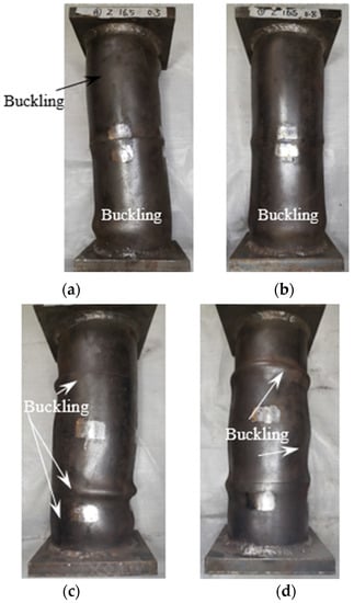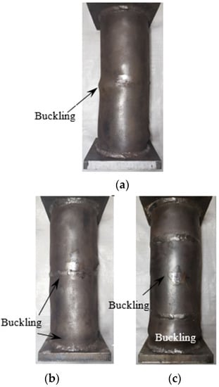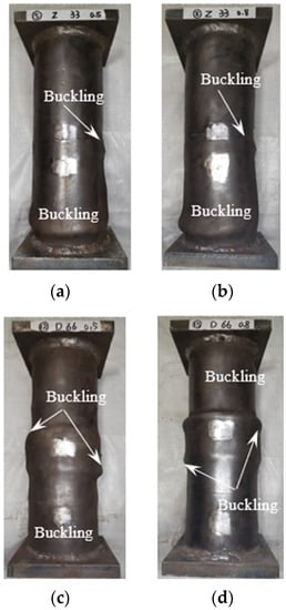 The second mode (Outer II) corresponds to the specimens with short inner lining tubes (specimen M6A, M9A, E6A and E9A), which shows that in addition to the outward buckling caused by the end effect, outward buckling also occurs at one of the weak positions of the specimen, i.e., the butt joint of the tube (Figure 2), as shown in Figure 7.