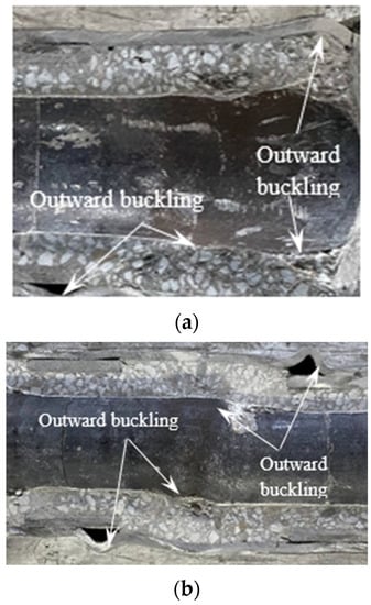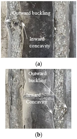 The second mode (Inner II) corresponds to the Outer II failure mode. The outward buckling of the inner steel pipe corresponds to the outward buckling of the end of the outer steel pipe, as shown in Figure 10a. Corresponding to the outward buckling at the other position of the outer steel tube, the inner steel tube has no obvious deformation, although the edge of the inner lining tube has outward buckling (Figure 10b).