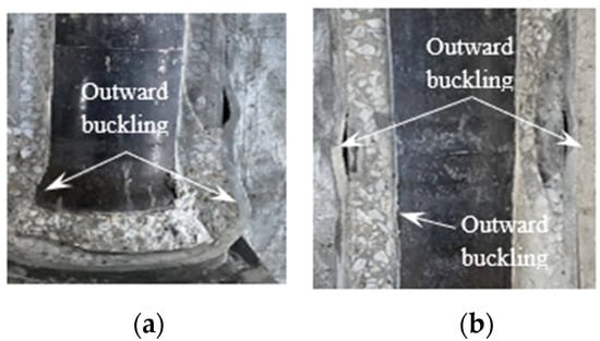 Failure modes of inner steel tube of common specimen and welded specimen. (a) Specimen C; (b) Specimen MW.