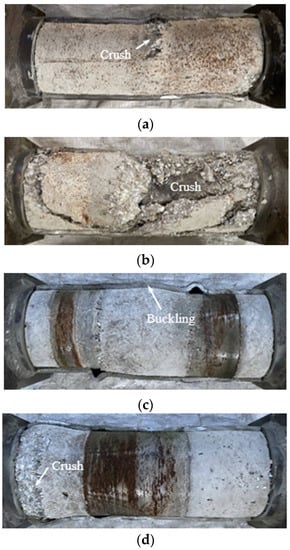 The failure mode of concrete is shown in Figure 12. It can be seen that the crushed or buckling of concrete corresponds to the steel tube buckling.