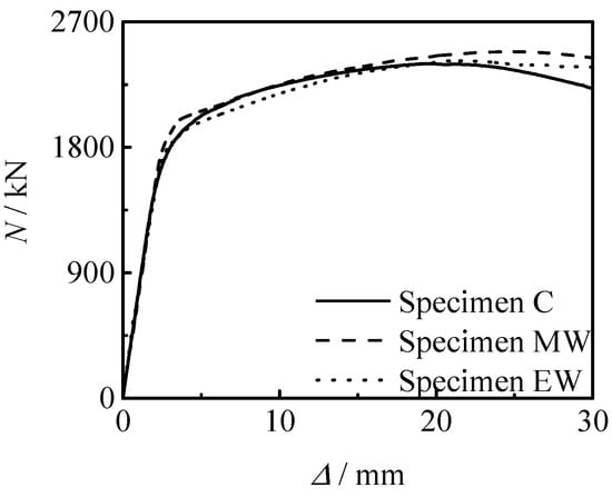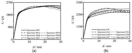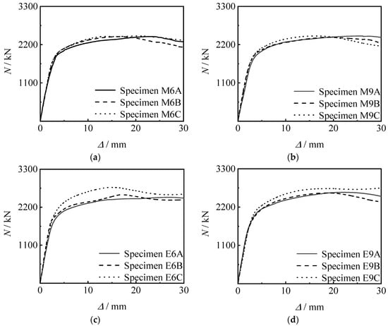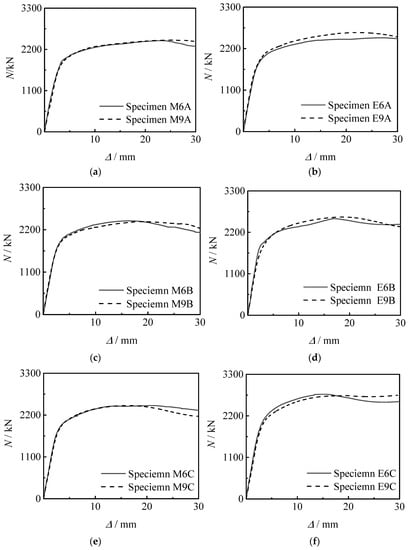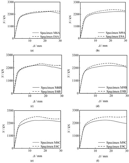 Figure 17 shows the influence of thread position on the N-Δ curve of the specimen. Compared to the mid-section connection specimen, the end-section connection specimen has a better constraint effect on concrete, therefore the macroscopic performance is as follows: the end connections have a greater impact on the bearing capacity of the specimen [24,25].