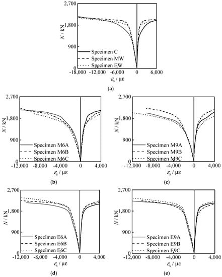 Figure 15 shows the N-εs curve of all specimens. It can be seen that the trend of all curves is similar, with steel pipes being compressed in the longitudinal direction and stretched in the transverse direction. Due to the small longitudinal strain, the Poisson’s ratio of the steel tube is usually constant, indicating that there is no interaction between the steel tube and the concrete at this time. With the increase of longitudinal strain, the Poisson’s ratio of concrete increases, indicating that the concrete gradually contacts the steel pipe. When the curve reaches the descending section, the lateral strain of the steel pipe increases significantly due to the increased restraint of the steel pipe on the concrete. Therefore, the pipe specimen connected through the inner thread still has good mechanical properties [21,22,23].