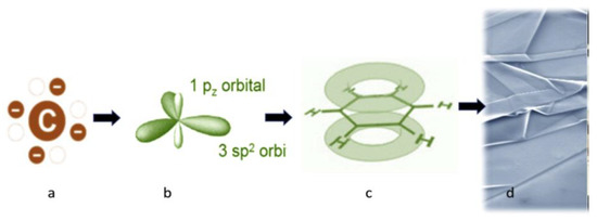 British scientists Geim et al. [32] discovered graphene in 2004. Graphene is a single-atom, two-dimensional crystal formed by the sp2 hybridization linkage of carbon atoms. It is the most desirable two-dimensional material and the hardest nanomaterial ever discovered. Graphene is an isomer of carbon with a thickness of <0.35 nm. It is an advanced two-dimensional material with a hexagonal atomic structure with one carbon atom at each vertex [33]. Graphene exhibits nonpolar properties, and nonpolar dehydroformer acids with aromatic rings can provide good wettability on graphene through nonpolar interactions on the surface [34]. SEM images of graphene bonding properties and monolayer graphene are shown in Figure 1 [35]. The different forms of graphene are shown in Figure 2 [35].