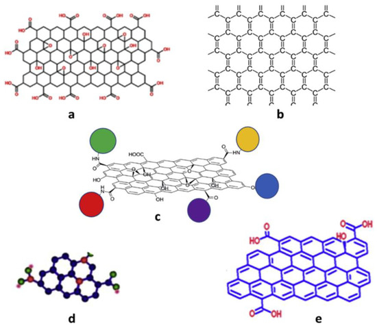 Different forms of graphene: (a) graphene oxide, (b) pristine graphene, (c) functionalized graphene, (d) graphene quantum dot, and (e) reduced graphene oxide. Reprinted from Ref. [35].