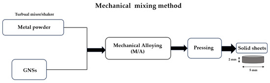 The mechanical mixing method is to distribute graphene in the matrix by mechanical stirring. This method is easy to operate and low cost, but some of the powder will be oxidized under high-speed ball milling. Nai et al. [52] successfully dispersed Ag–GNSs into a Sn–Ag–Cu solder matrix by ball milling and mechanical stirring. Finally, the composite solder was successfully produced by hot-pressure sintering. Sayyadi’s [56] team successfully prepared graphene composite solder by powder metallurgy and mechanical mixing methods. The mechanical mixing method to prepare the composite solder is shown in Figure 3.