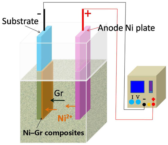 Electrochemical deposition is a processing method. Positive metal ions in the electroplating solution receive electrons by introducing an external electric field. A coating is formed on the surface of the cathode substrate [58]. The advantage of the electrochemical deposition method is that the reaction rate can be controlled by adjusting parameters such as electrolyte formulation and supply voltage. Different combinations of properties are obtained by adjusting the parameters of the composite preparation. At the same time, the graphene in the solution is uniformly adsorbed with the metal particles, effectively avoiding the agglomeration phenomenon. Composites prepared by electrochemical deposition techniques can also improve the wear and corrosion resistance of the material. The electrochemical precipitation method is shown in Figure 5.