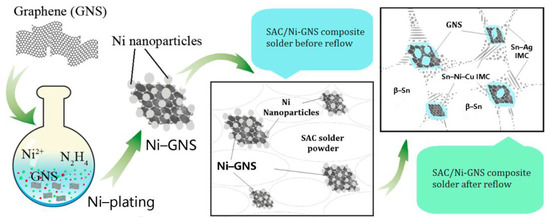 Ni nanoparticles are ideal for modifying graphene because Ni nanoparticles readily react with Sn-based lead-free solder alloys and can form IMC layers during the soldering process. Khodabakhshi et al. [89] plated nickel on the surface of GNSs by the chemical plating method. Then, a Ni–GNSs–SAC composite solder was prepared by the powder metallurgy method. The results showed that adding GNSs could improve the morphology of IMCs. Generated IMCs showed rounded particles and uniform dispersion. This solder’s improved yield strength, tensile strength, and ductility are due to the inhibition of microstructural coarsening by ultrafine intermetallic particles and reinforcing nanosheets.