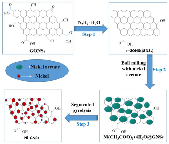 By the self-assembly method, an aqueous solution of GO is mixed with metal particles. Metal particles are bound to GO through covalent or noncovalent bonds. The advantages include simple and controllable particle size, loading, and uniform distribution. Wang et al. [61] successfully anchored Ni particles to GNSs using a self-assembly method. A flow chart of the self-assembly method is shown in Figure 7.