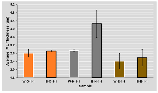 Solder mask influence on the average IMC thickness for samples with the ROL1 flux (Black/White)—(OSP, HASL, ENIG)—(ROL0, ROL1)—(1, 2 reflows). Reprinted from Ref. [66].