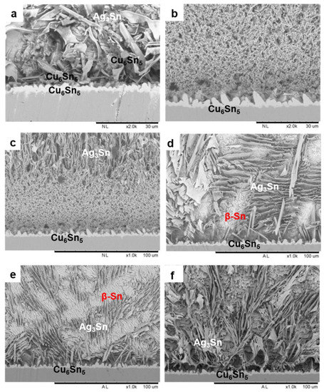 At the same time, Sn–0.7Cu solder is more susceptible to galvanic corrosion due to the significant difference in potential between Sn and Cu [6]. Research on Sn–Cu lead-free solders has also increased domestically and internationally. However, its disadvantages must be overcome to achieve the replaceability of Sn–Cu lead-free solder, for example, high melting points, low mechanical properties, the tin-whisker-growth phenomenon, the increased possibility of conversion to gray tin, low reliability, and a series of other problems. The Sn–Cu solder system has the advantages of high ductility, fatigue resistance, and a low price. However, the application of Sn–Cu solder in electronic packaging is limited by its high melting point and poor wettability [77,78,79].