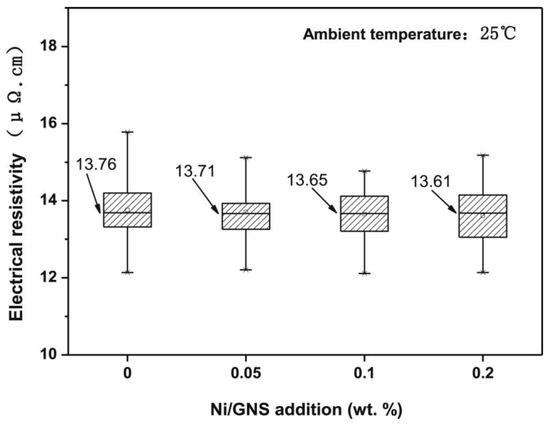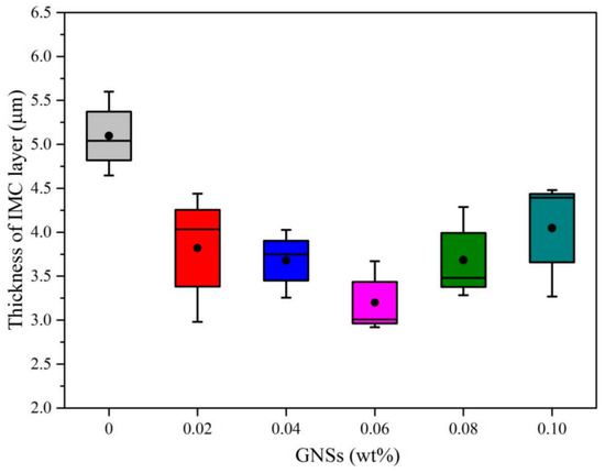 According to Yang’s report [55], the thickness of the IMC layer at the interface decreased and then increased with the addition of GNSs. Figure 11 shows the thickness of the IMC layer at the Sn–20Bi–xGNS/Cu solder joint. Ma et al. [22] prepared Sn–58Bi–GNSs composite solders by the powder metallurgy method. It was found that the addition of GNSs could refine the grain size. The optimum addition amount given is 0.03 wt.%.