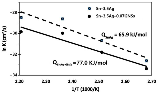 Arrhenius plots of the total intermetallic compound layer growth for Sn3.5Ag/Cu and Sn3.5Ag–0.07GNSs/Cu solder joints. Reprinted with permission from Ref. [87]. 2022, Elsevier Science & Technology Journals.