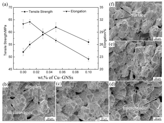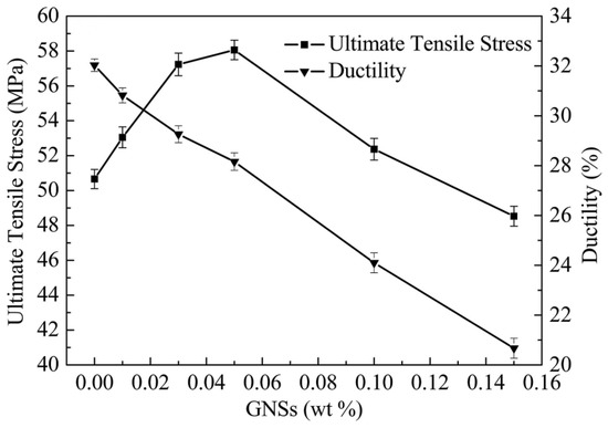 During the soldering process, GNSs may be enriched at the solder/flux interface. The presence of GNSs reduces interfacial energy. As a result, the interfacial tension between the solder and flux is reduced, thus providing smaller contact angles and improved wetting of the solder substrate [69,70]. Adding GNSs to the solder matrix increases the material’s ultimate tensile strength (UTS), and the ductility decreases by a small amount. The melting points of SAC solder and SAC–GNS composite solder were measured. When GNSs were added to the solder matrix, there was no significant change in the melting point of the solder. This is due to the alloy’s melting point being a physical characteristic that is inherent to the alloy. Trace amounts of inert GNSs barely impact the melting point of nanocomposites. Additionally, the melting point of nanocrystalline alloys is slightly lower than that of bulk alloys. As a result, the melting point of SAC is not considerably impacted by the addition of GNSs.