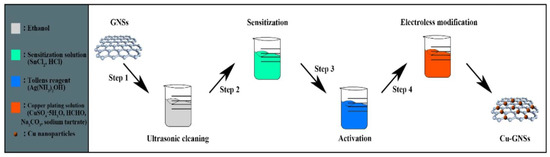 The chemical plating technique refers to the absence of an electric current. With the help of a suitable reducing agent, the metal ions in the chemical plating solution are reduced to metal and deposited onto the graphene surface. Chemical plating technology is a deposition process that produces metals through controlled redox reactions under the catalytic action of metals. Due to its characteristics of low waste emissions, low environmental pollution, and low cost, in many fields, chemical plating technology has gradually replaced electroplating as an environmentally friendly surface treatment process. A schematic diagram of the electroplating method is shown in Figure 6 [60].