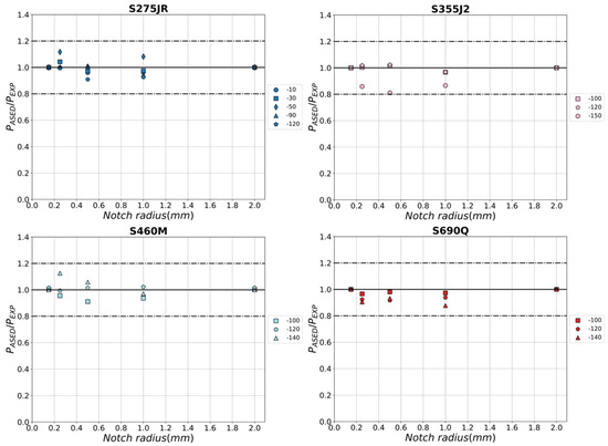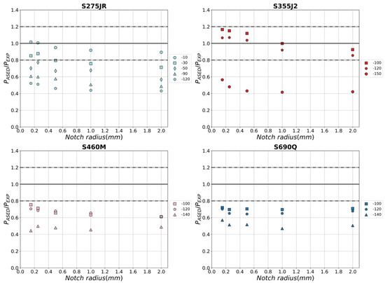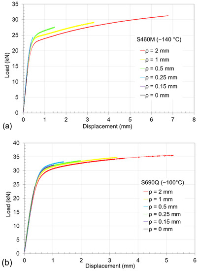 In addition, some examples of the obtained load–displacement curves are plotted in Figure 3, showing the behavior of the six notch radii (0, 0.15, 0.25, 0.5, 1, and 2 mm) for the case of the steel S460M (tested at −140 °C) and S690Q (tested at −100 °C). It is clear how even these medium (S460M) and high (S690Q) strength structural steels tested at such low temperatures develop a non-linear behavior due to the notch effect. The same effect is also observed in the S275JR and S355J2 steels.