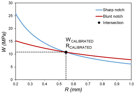 In this sense, a novel calibration of the characteristic parameters (Wc and Rc) of the ASED is proposed, somewhat similar to that used in the Point Method (PM) of the Theory of Critical Distances (TDC) [2]. In order to calibrate the parameters Wc and Rc, a deformation energy density (W) profile can be obtained as a function of the distance (R) to the notch tip. Thus, by obtaining two W profiles for two different notch radii, the cut-off point between the two curves will correspond to the calibrated values of Wcalibrated and Rcalibrated, as shown in Figure 5. Once the calibrated parameters are defined, fracture load predictions (PASED) for any other notch radius can be easily derived using the conventional ASED procedure described in Section 3.1. Therefore, with just a small experimental campaign using specimens with two different notch radii, it would be possible to predict fracture loads for notches of different radii. This proposal is actually an extrapolation of the linear-elastic ASED criterion to non-linear situations through the calibration of the ASED parameters and their subsequent application to statically equivalent linear-elastic loading conditions.
