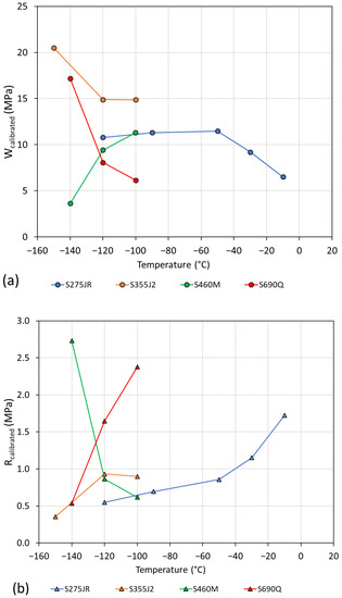 In Figure 7, the fracture load estimations obtained using the calibrated ASED are presented. It is evident that employing the calibrated ASED values significantly improves the accuracy of the load predictions in comparison to the linear-elastic ASED, with all estimations falling within a margin of error of ±20%. The maximum error observed is 19% for S355J2 at a temperature of −150 °C and a notch radius of 0.50 mm, while the average error across all predictions is below 6%. This demonstrates the capability of accurately predicting fracture loads with the utilization of this calibration approach by using the notch radius of 0.15 mm and 2 mm. At the same time, Figure 8 shows the values of Wcalibrated (Figure 8a) and Rcalibrated (Figure 8b) for the four steels at the different temperatures studied. Although no tendency among the ASED parameters and the temperature was found, they all had the same magnitude order.