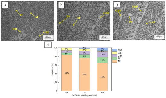 Microstructure morphologies of 50 kJ/cm (a), 75 kJ/cm (b), 100 kJ/cm (c), and a schematic diagram of the percentage of microstructures (d).