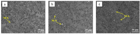 Four percent LePera’s reagent-etched samples of 50 kJ/cm (a), 75 kJ/cm (b), and 100 kJ/cm (c), where the matrix is gray and the M/A constituents are white.