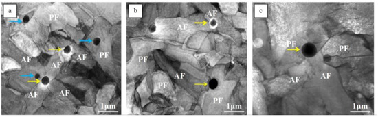 The TEM images of the weld metal are presented in Figure 4. As shown in Figure 4, the main microstructure of the weld metal was AF with a little PF. As Ej increased, the size of AF increased significantly, and the number of inclusions decreased while its size increased. By comparison, it was found that not all inclusions produced effective promotion of AF nucleation, and the small-sized inclusions shown in Figure 4a (indicated by the blue arrows) were engulfed by the growth of ferrite. The larger inclusions (indicated by the yellow arrows) had a stronger tendency to stimulate the nucleation of AF. Ferrite laths nucleated on larger-sized inclusions and grew radiologically. Subsequently, neighboring ferrite laths nucleated on the previously existing laths by mutual induction, similar to the previous study [17].