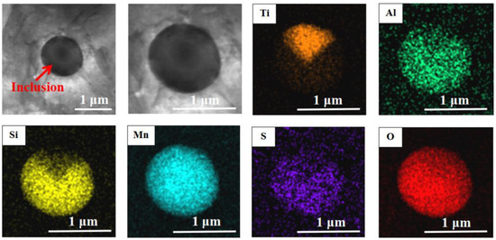 The EDS mapping image of a typical inclusion, as shown in Figure 5, revealed that the inclusions were composite oxide and sulfide composed of Al, Ti, Si, and Mn.