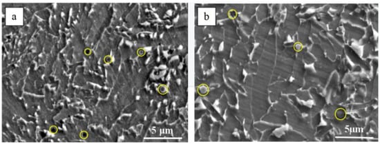The distribution of inclusions in the weld metal is shown in Figure 6, where the inclusions that stimulate AF nucleation are circled in yellow. All inclusions were counted under 25 fields of scanning electron microscopy using Image-Pro Plus software to minimize errors. With Ej increasing from 50 kJ/cm to 100 kJ/cm, the total number of inclusions decreased significantly. The average size of inclusions increased from 0.59 to 1.26 μm, and the number of large-sized inclusions increased, with the maximum size reaching about 2.5 μm.