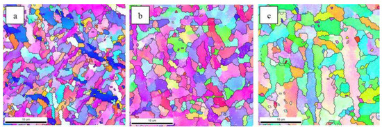 Inverse pole figures (IPF) were obtained using electron backscatter diffraction, as shown in Figure 7a–c. Previous studies [18,19,20] usually defined the threshold of HAGB at 15° because grain boundaries with misorientation tolerance angles (MTA) greater than 15° have higher energy to effectively force the deflection or termination of crack propagation. Therefore, in this paper, grain boundaries with an MTA less than 15° between adjacent grains were defined as low-angle grain boundaries (LAGBs), while grain boundaries were defined as high-angle grain boundaries (HAGBs) when the MTA was higher than 15°. The HAGBs were marked with black lines in Figure 7. As shown in Figure 7, HAGBs were formed between adjacent AF or PF, which could effectively hinder crack propagation [21].
