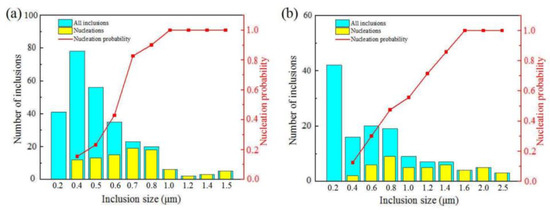 Size and number distribution of inclusions and statistics of nucleation rate of AF promoted by inclusions with different sizes under different Ej: (a) 50 kJ/cm and (b) 100 kJ/cm.