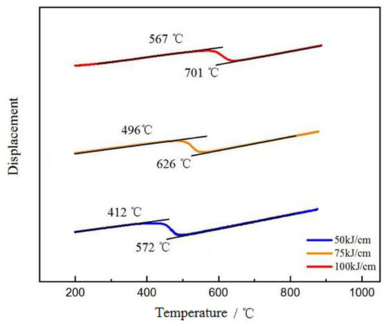 To better understand the influence of various Ej on final microstructures, the continuous cooling expansion curves of each specimen were measured. Subsequently, the phase transition temperatures (Ar3) from austenite to ferrite were measured using the tangent method, as shown in Figure 13. As Ej increased from 50 kJ/cm to 100 kJ/cm, Ar3 decreased from 701 °C to 572 °C.