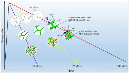 During the cooling process of the welding thermal cycle, with the transformation from austenite to ferrite, C diffuses from AF, PF, and GBF to the residual austenite γ′, thus causing the enrichment of C in γ′ and improving the stability of γ′ [38]. On further cooling to near room temperature, γ′ transformed into M/A constituents. When Ej was low, the diffusion distance of C was shorter because of the decreased diffusion coefficient due to the faster cooling rate [37]. Accordingly, the size of the M/A constituents formed at the grain boundaries was small and mainly point M/A. With the increase of Ej, C atoms had sufficient time and dynamics to diffuse; thus, the number and size of M/A constituents increased, while more elongated M/A constituents were formed along the grain boundaries between the ferrite [39,40]. The corresponding schematic representation of the microstructural transformation is shown in Figure 14.