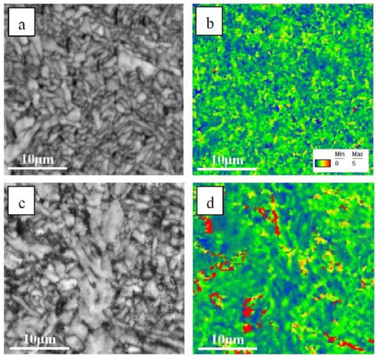 Band contrast map and kernel average misorientation map of the 50 kJ/cm (a,b) and 100 kJ/cm (c,d) samples.