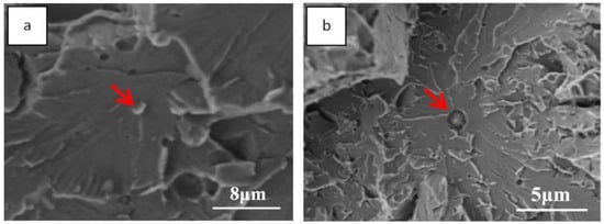 As shown in Figure 10, with the increase in Ej, the cleavage fracture occurred near the V-notch, i.e., the occurrence of the cleavage fracture was advanced. At the same time, it was observed that a large number of cleavage surfaces of the 100 kJ/cm sample nucleated at the large size inclusions and M/A constituents as shown in Figure 16. The bulging of the M/A constituent at the origin of the cleavage surface indicated that crack initiation should be due to the debonding of the M/A constituent at the interface with the ferrite matrix [11]. Therefore, with the increase in Ej, the coarsening of inclusions and M/A constituents significantly reduced the cleavage crack initiation energy.