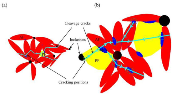 Schematic diagram of cleavage microcrack initiation and propagation in the weld metal under 50 kJ/cm (a) and 100 kJ/cm (b).