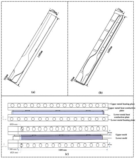 Thermodynamic simulations that can be used for GMP production were constructed by analyzing the thermodynamic behavior of metal-heated plates, conductors, and dielectrics. According to Figure 1a,b, the size of the metal heating conductor was 1600 mm × 300 mm× 80 mm, and the size of the metal heating plate was 1600 × 300 × 50 mm. The diameters of the holes on the upper and lower metal heating plates were 28 mm and 25 mm, respectively. Figure 1c clearly shows the three-dimensional structures of the metal heating plate, conductor, and mold, as well as their main dimensions. In this model, the influence of the glass cover plate located inside the mold was ignored. Fifteen 1.0 kW·h heating pipes were installed at the top of the mold, while fourteen 1.2 kW·h heating pipes were installed at the bottom.