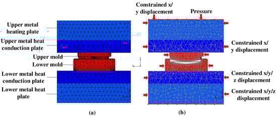 Three-dimensional finite element (FEM) mesh model (using MSC Marc) and its cross-sectional view of GMP. (a) 3D finite element mesh model of the glass molding process, (b) the cross-sectional view of the model.