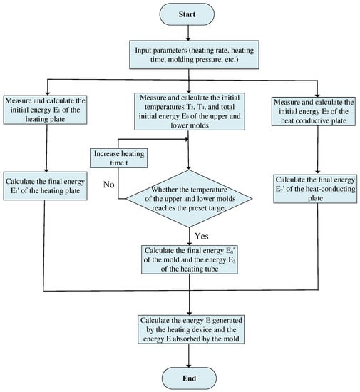 Figure 4 depicts the energy efficiency calculation flow of the GMP system, which contains the heat transfer between the metal heating plate and the heat conductor, as well as the heating tubes. To better simulate the actual situation, the simulation model can be used with multiple temperature measurement points. and indicate the average temperatures of the initial and final status of the heating stage, respectively. Then, Equation (5) can be adopted to estimate the effect of heat transfer on the energy inside the metal heating plate, so that the heat loss () can be estimated more accurately [22].