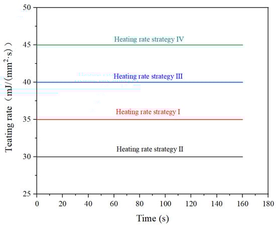 The GMP is affected by the heating rate during the heating phase, which in turn has an effect on energy consumption. In this study, four different strategies for the heating rate were used to investigate this issue. Figure 5 shows the four different heating methods, where the heating rate of the original heating strategy Ⅰ (0–160 s) was 35 mJ/(mm2·s), which effectively improved the forming effect of glass. Throughout the heating process, the value of heating rate strategy Ⅱ remained at 30 mJ/(mm2·s), the value of strategy Ⅲ remained at 40 mJ/(mm2·s), and finally, the value of strategy Ⅳ remained at 45 mJ/(mm2·s).
